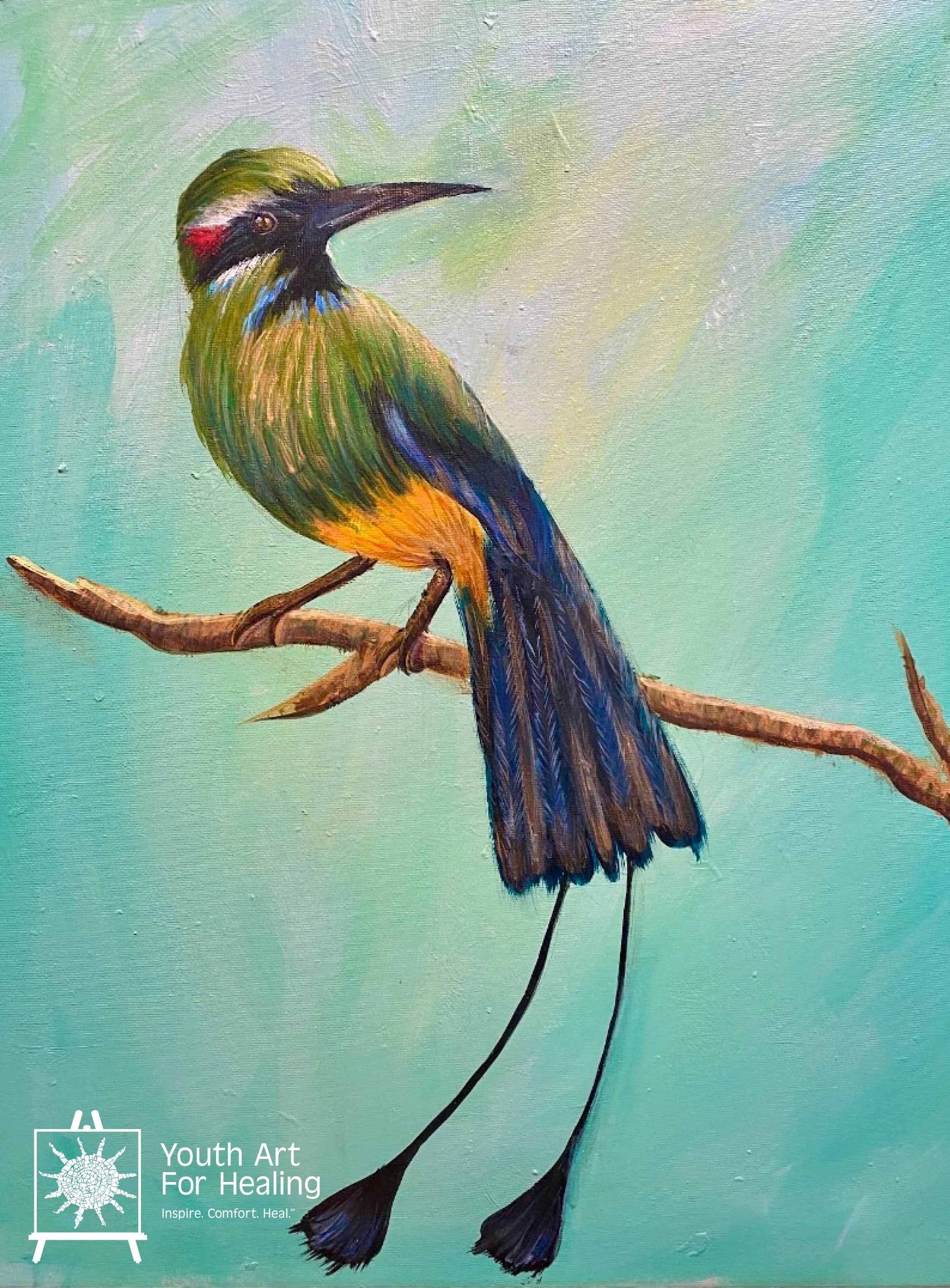 Enrolled in the Montgomery County Public Schools Visual Art Center (VAC) Program during the 2023-24 school year, Giselle Maravilla created a beautiful painting of the Torogoz, the national bird of El Salvador, for her award application. Her painting is permanently installed at MedStar Georgetown University Hospital, where it serves as “a reminder of the importance of resilience and adaptation in the face of adversity,” as Giselle wrote in her application.