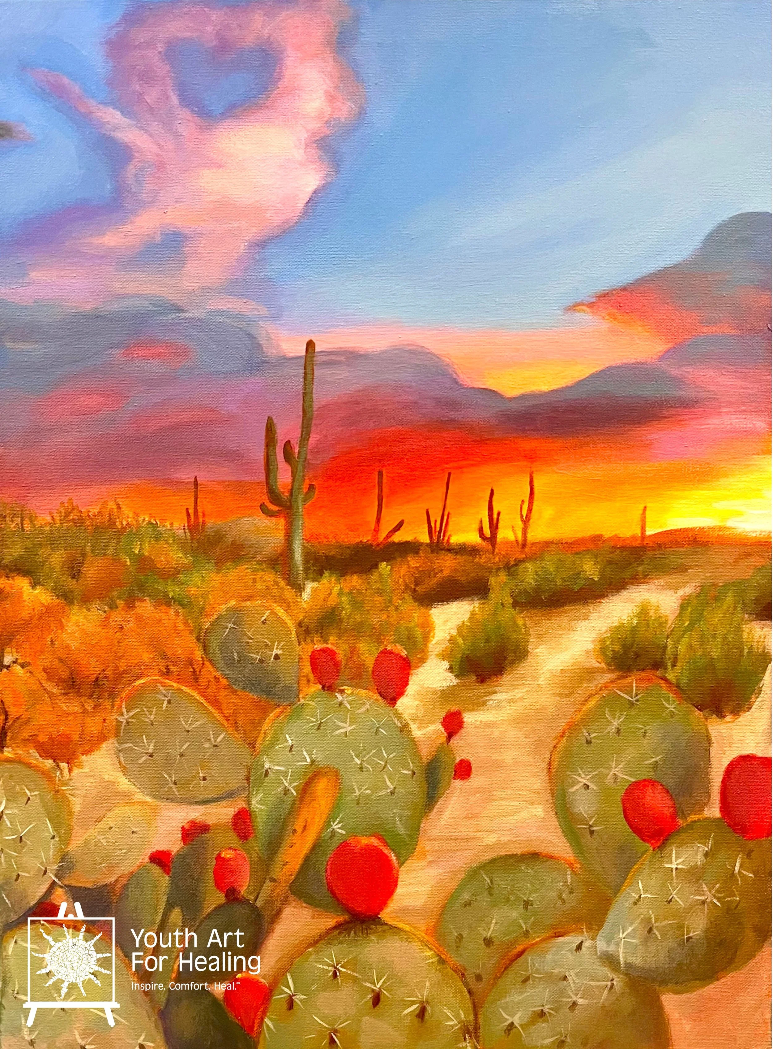 Alanna created a striking landscape of an Arizona sunrise. A dedicated National Art Honor Society (NAHS) member, Alanna participated in YAFH creating paintings for installation in local hospitals, and served in a leadership role with The Memory Project to create artworks for children in Cameroon and India. Her artwork has received recognition from local and regional art competitions, including Friends of the Yellow Barn Studio, Black Rock Art Studio, and the 8th District Congressional Art Competition Second Place Winner 2023. Alanna shared that she “found this love [of community service] through painting and donating landscapes with the help of Youth Art For Healing," and said that “As I start my college years, I hope to involve myself in a program or organization similar to YAFH that combines art with the ability to support the mental health of veterans. My hope is that creating pieces of and for people who struggle with PTSD or depressive disorders is that they will raise awareness of these conditions and their effects on the brave young men and women who serve or have served in the U.S. Military. I hope to utilize my own and others’ art as a medium to heal those who need support and to destigmatize mental health conditions.”