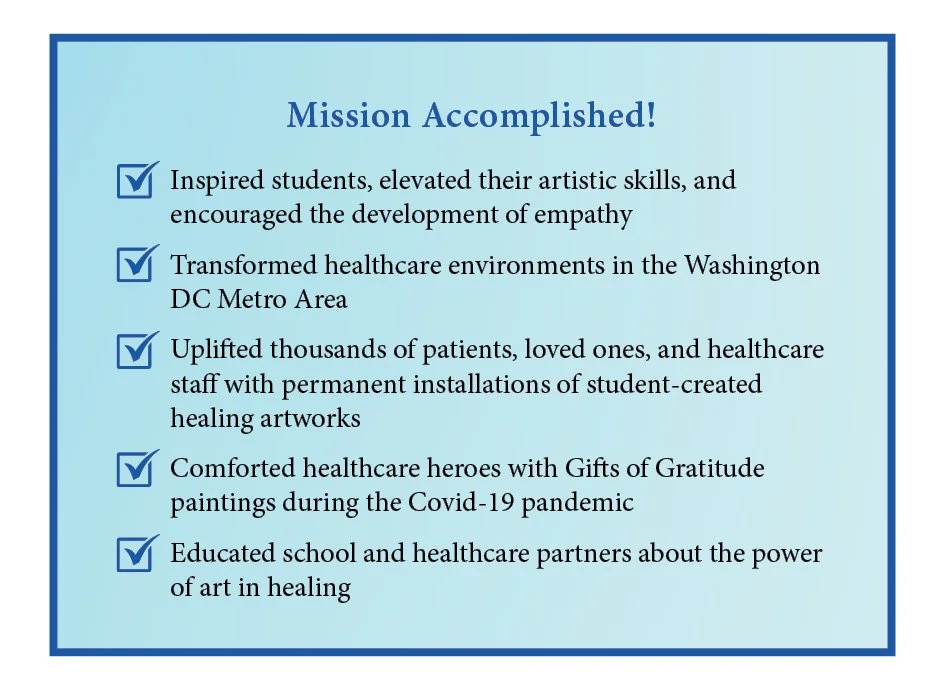 Youth Art For Healing was founded in 2012 with a mission to bring works of art created by youth into healthcare environments to provide a sense of comfort, inspiration, and healing for patients and their loved ones, and healthcare professionals. After 11 years of working together, we are celebrating a mission accomplished!